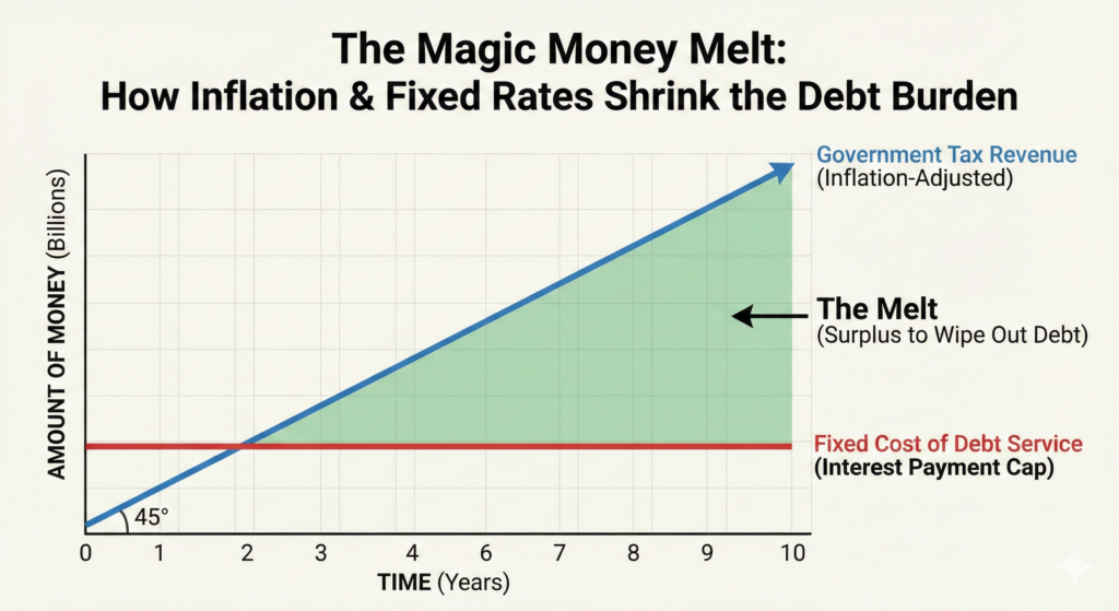 This widening gap is “the melt.” The debt did not disappear on paper, but its weight, its burden relative to the economy, evaporated.